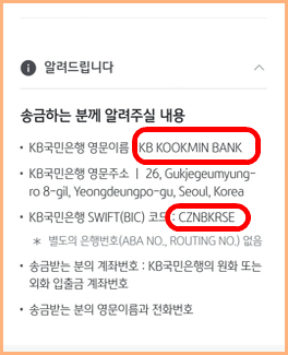 국민은행 앱에서 KB국민은행 영문명 표기와 함께 아래로 내리면 SWIFT(BIC) 코드 CZNBKRSE를 확인하고 애드센스 결제정보에 입력하시면 됩니다.