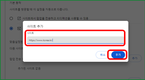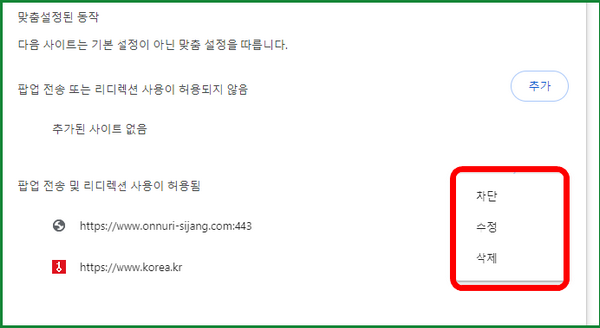 '맞춤설정에서 팝업 전송 및 리디렉션 사용이 허용됨'에서 '추가'를 클릭하고 팝업차단을 해제하고자 하는 사이트를 추가합니다.