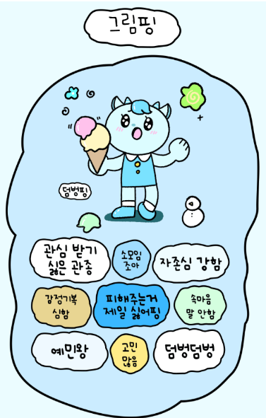 그림핑은 INFP 유형에 해당하는 캐릭터로, 예술적이고 감수성이 풍부한 성격을 상징합니다.