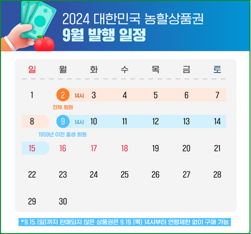9월 2일(전체), 9월 9일(1959년 이전 출생자) 발행일 당일에는 상품권이 빠르게 판매될 수 있으므로, 구매를 원하시는 분들은 발행 시간에 맞춰 빠르게 접근하는 것이 좋습니다.