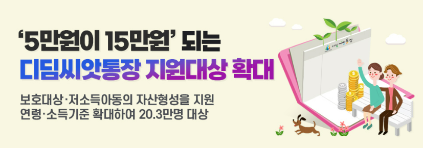 ※ 디딤씨앗통장 가입할 수 있는 아동이 작년 7만 명에서 올해 20.320.3만 명으로 확대되었고 0세부터 가입할 경우엔 18세까지 최대 3천만 원의 목돈이 마련되므로 사회에 진출할 때 자립용도에 도움이 될 것입니다.