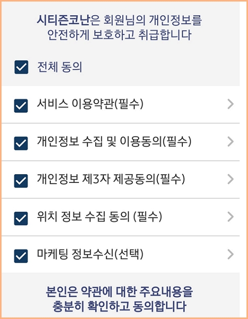 시티즌코난 앱을 다운로드한 후 개인정보 수집 및 이용동의 등 이용 약관에 동의하고 앱을 실행하면 됩니다.
