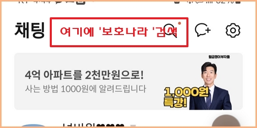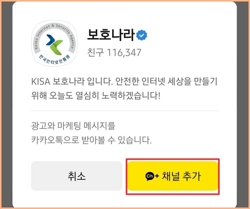 카카오톡 채팅창에서 '보호나라'를 검색하고 채널을 추가합니다.