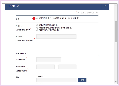 ▶ 성명이나 주민등록번호는 자동세팅 되므로 사용용도와 관련 내용을 직접 입력하셔서 발급받으면 됩니다.