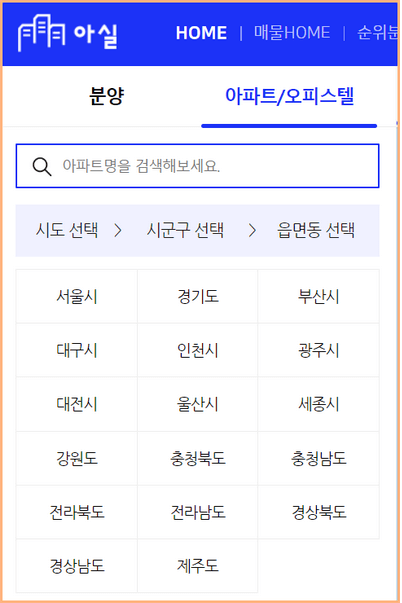 아실 홈페이지에 접속하면 분양정보 및 아파트/오피스텔에 관련된 정보를 바로 검색해 볼 수 있어 좋습니다.