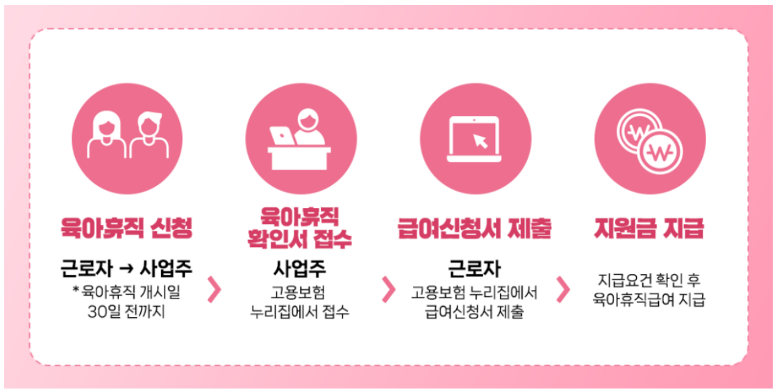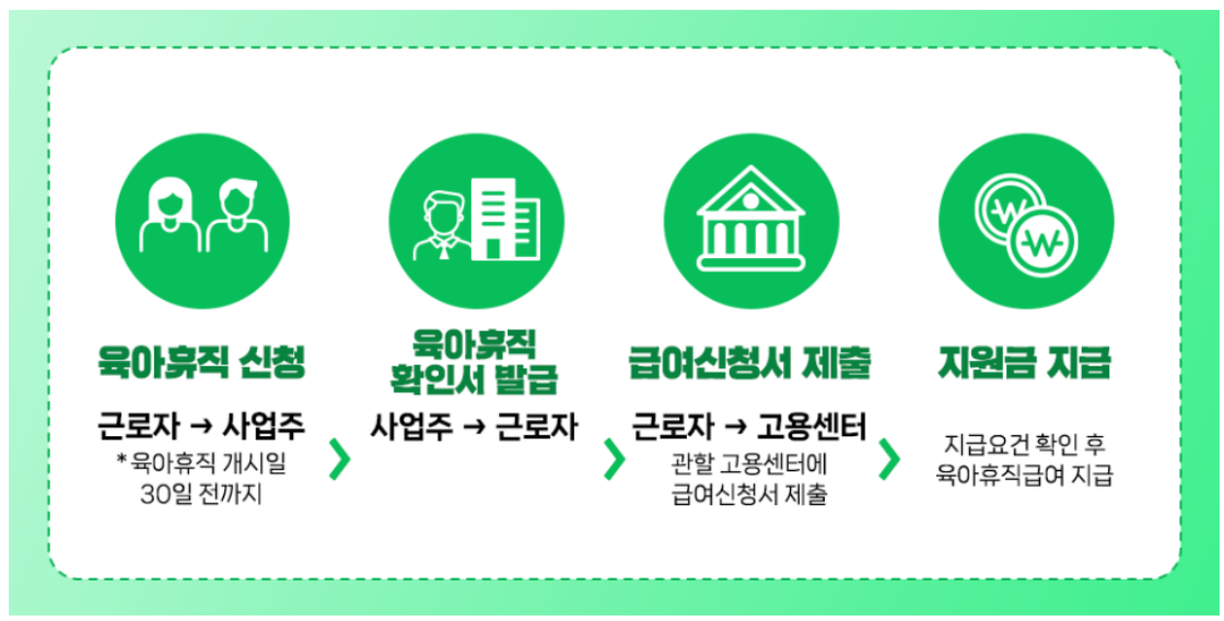 필요 서류는 육아휴직 급여신청서(근로자), 육아휴직 확인서(사업주), 임금대장(임금을 확인할 수 있는 증빙자료)