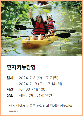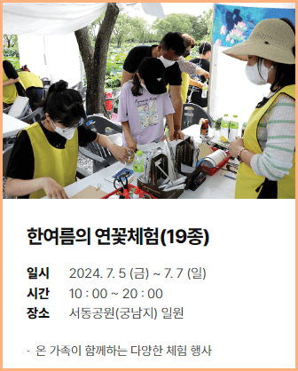| 한여름의 연꽃체험 | 7월 5일(금) ~7월7일(일) | 10:00 ~ 20:00 | 서동공원(궁남지) 일원 |