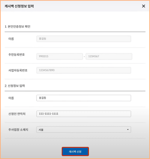 7. 캐시백 신청정보에 본인인증정보와 신청정보를 입력하고 캐시백 신청을 하시면 신청이 완료됩니다.
