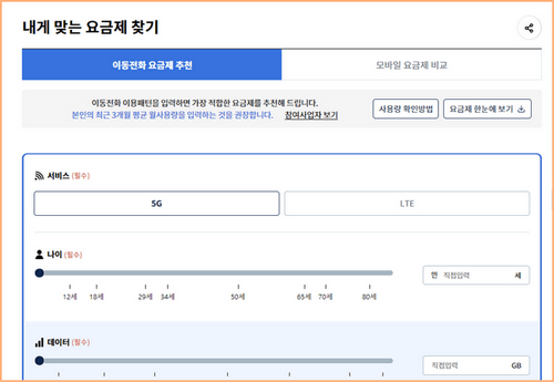 내가 사용하는 데이터 사용량과 음성 사용량을 입력하면 조건에 맞는 통신 3사의 요금제를 추천받을 수 있습니다.