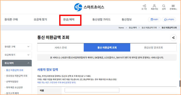스마트초이스> 환급/혜택> 통신 미환급액 조회