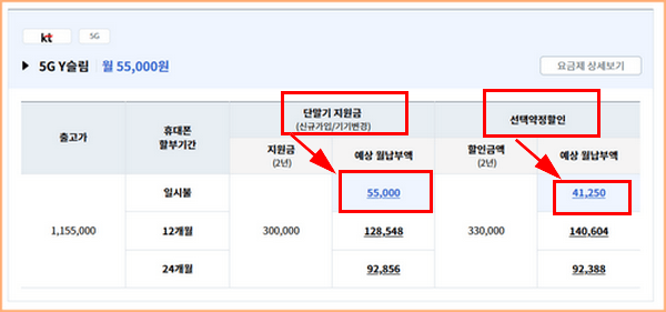 지금 사용하는 통신사 KT로 검색해 보니 휴대폰 가격과 월 납부할 요금과 단말기 지원금과 선택약정할인 시 어떤 선택을 할지 판단이 됩니다.