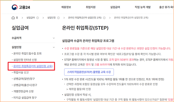 고용 24> 실업급여> 실업인정> 온라인 취업특강(1차 실업인정 교육)> 스마트직업훈련(STEP) 플랫폼 교육 수강