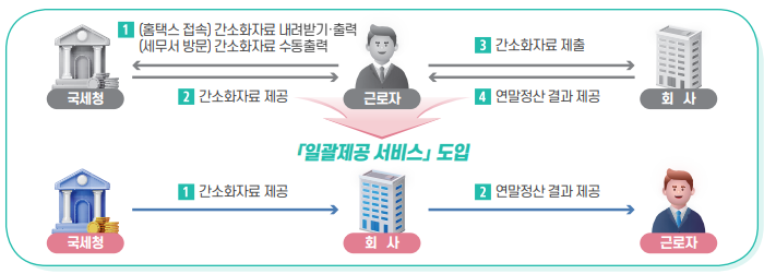 기존에는 근로자가 직접 홈택스에 들어가거나 세무서에 가서 간소화 자료를 받아 제출했는데 근로자(부양가족 포함)의 간소화자료 제공동의만으로 국세청에서 직접 회사에 제공하는 서비스입니다.