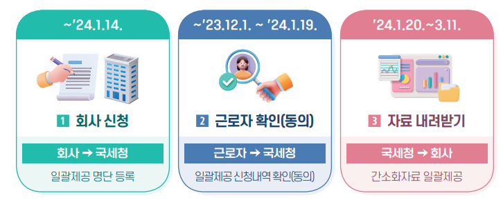 근로자는 23년 12월 1일부터 24년 1월 19일까지 일괄제공 신청 내용에 대한 확인을 진행해 국세청 확인 절차 후 근로자의 간소화자료를 회사에 일괄 제공합니다.