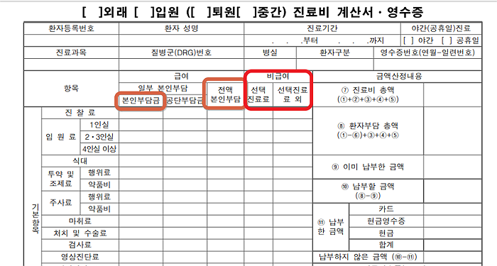 본인부담 의료비 계산법 급여일부본인부담금+전액본인부담금+비급여 =본인부담 의료비 |