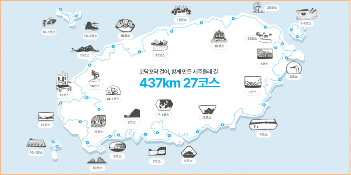 제주올레길은 27코스로 코스마다 특징이 있습니다. 어떤 코스를 선택하더라도 즐겁고 알찬 여행을 할 수 있을 것입니다. 제주올레 홈페이지를 방문하면 코스에 대한 정보를 더 꼼꼼히 파악할 수 있고 자신의 취향에 맞게 선택할 수 있습니다.