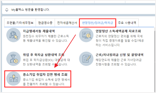 MY홈택스로 들어가 연말정산/장려금/학자금으로 들어가 중소기업 취업자 감면 명세 조회를 하실 수 있습니다.
