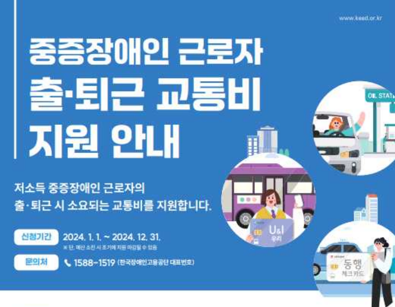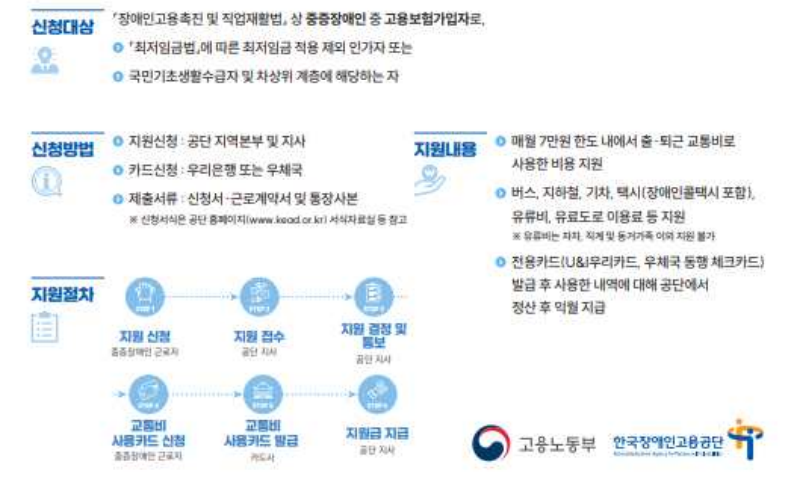 중증장애인 근로자 출·퇴근 교통비 지원이란 저소득 중증장애인이 출퇴근할 때 근로자의 부담을 덜고 안정적인 직장생활을 지원해 주고자 출·퇴근 시 버스비나 택시비, 자가용 주유비 등 소요되는 경비를 지원하는 사업으로 신청 방법과 지원 내용 등에 대해서 알아볼까 합니다