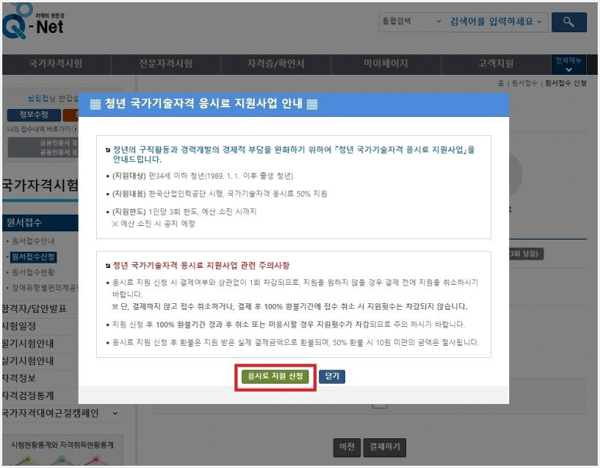 ● 응시료 지원사업에 대한 안내와 유의사항을 잘 확인합니다.