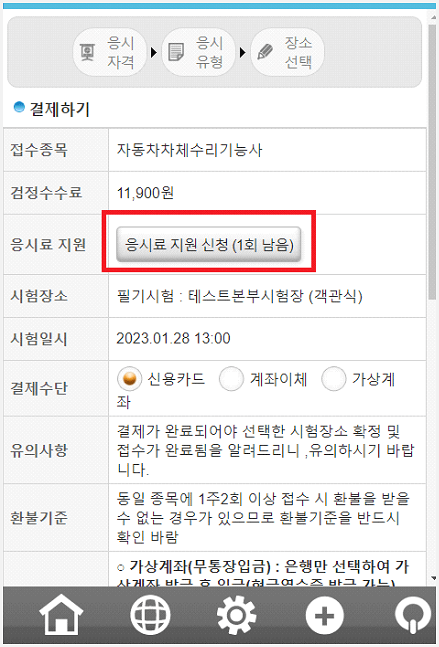 ● 응시료 50% 지원 결과를 확인하고 신용카드나 계좌이체 등으로 응시료를 결제하면 됩니다.