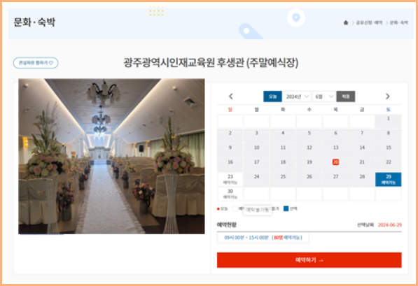 공유누리에서 예비부부들은 특별한 결혼식을 위한 공공 예식공간을 손쉽게 예약할 수 있게 되었습니다. 예비부부들이 원하는 지역의 예식공간을 검색을 통해 예약할 수 있습니다. 경제적 부담을 줄이고 개성 있는 결혼식을 준비할 수 있는 기회가 더욱 확대될 것입니다. 특별한 결혼식을 계획해 보시길 바랍니다.