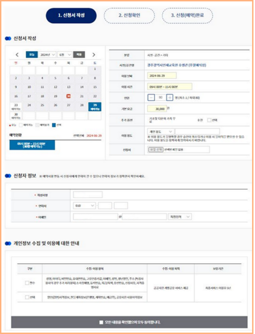 예약신청과 승인, 예약취소에 대한 내용은 신청자의 휴대폰으로 안내 메시지가 전송됩니다.