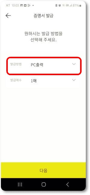 저는 PC출력을 선택하고 발급 매수 1매를 선택 후 다음 단계를 진행합니다.