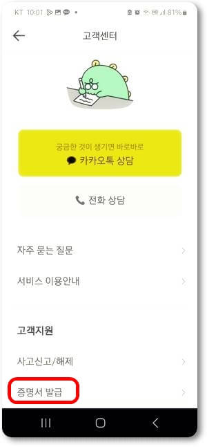 고객센터 메뉴에서 아래쪽 고객지원으로 화면을 이동하면 증명서 발급 항목을 선택하면 됩니다.