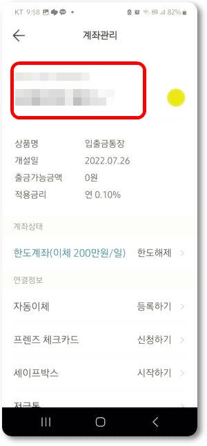 카카오뱅크 메인 메뉴에서 본인의 통장을 클릭하고 들어가 스마트폰화면 위에 보이는 톱니모양(설정버튼)을 클릭해서 들어갑니다.