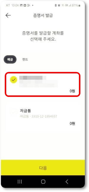계좌개설확인서를 선택하고 다음으로 이동합니다.