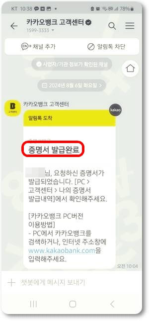 계좌개설확인서 발급 신청이 완료되었습니다. 카카오톡으로도 요청한 증명서가 발급되었다는 메시지를 확인할 수 있습니다. 기관 등에 제출을 위해서는 프린터가 필요하므로 발급 신청 때 선택한 PC출력을 위해서는 PC에서 카카오뱅크 홈페이지로 들어가야 합니다.