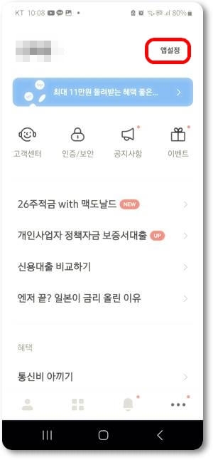 메인 화면 아래쪽 점 3개 버튼을 클릭하고 들어가면 오른쪽 상단 앱설정 메뉴를 찾을 수 있습니다.