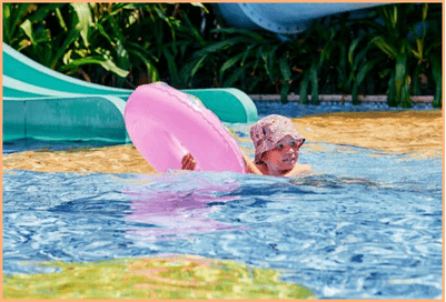 흐르는 물에서 돌면서 튜브를 타고 즐기는 유수풀, 시원한 물줄기가 쏟아지는 아쿠아링, 선택을 할 수 있는 선텐장이 설치되어 있습니다.
