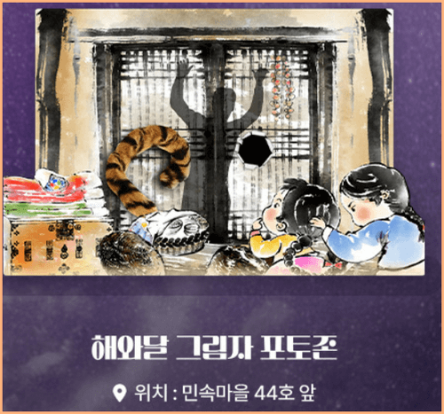 ▶ 한국민속촌 그림자 포토존: 상가마을의 달빛그림자 포토존, 민속마을 44호 앞의 해와 달그림자 포토존, 관아 담벼락의 연분 그림자 포토존, 민속마을 25호 옆의 귀굴 그림자 포토존